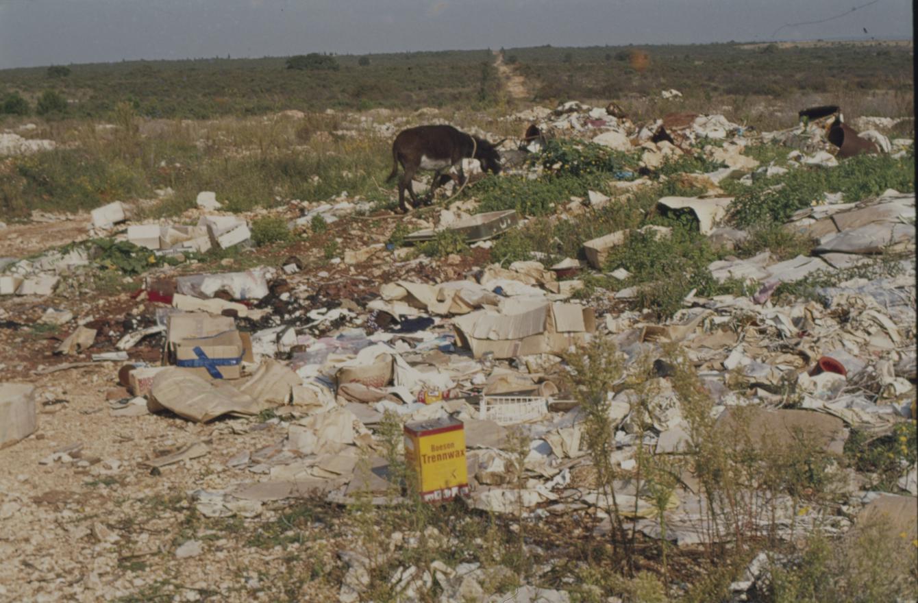 Gradski deponij; magarac u potrazi za hranom