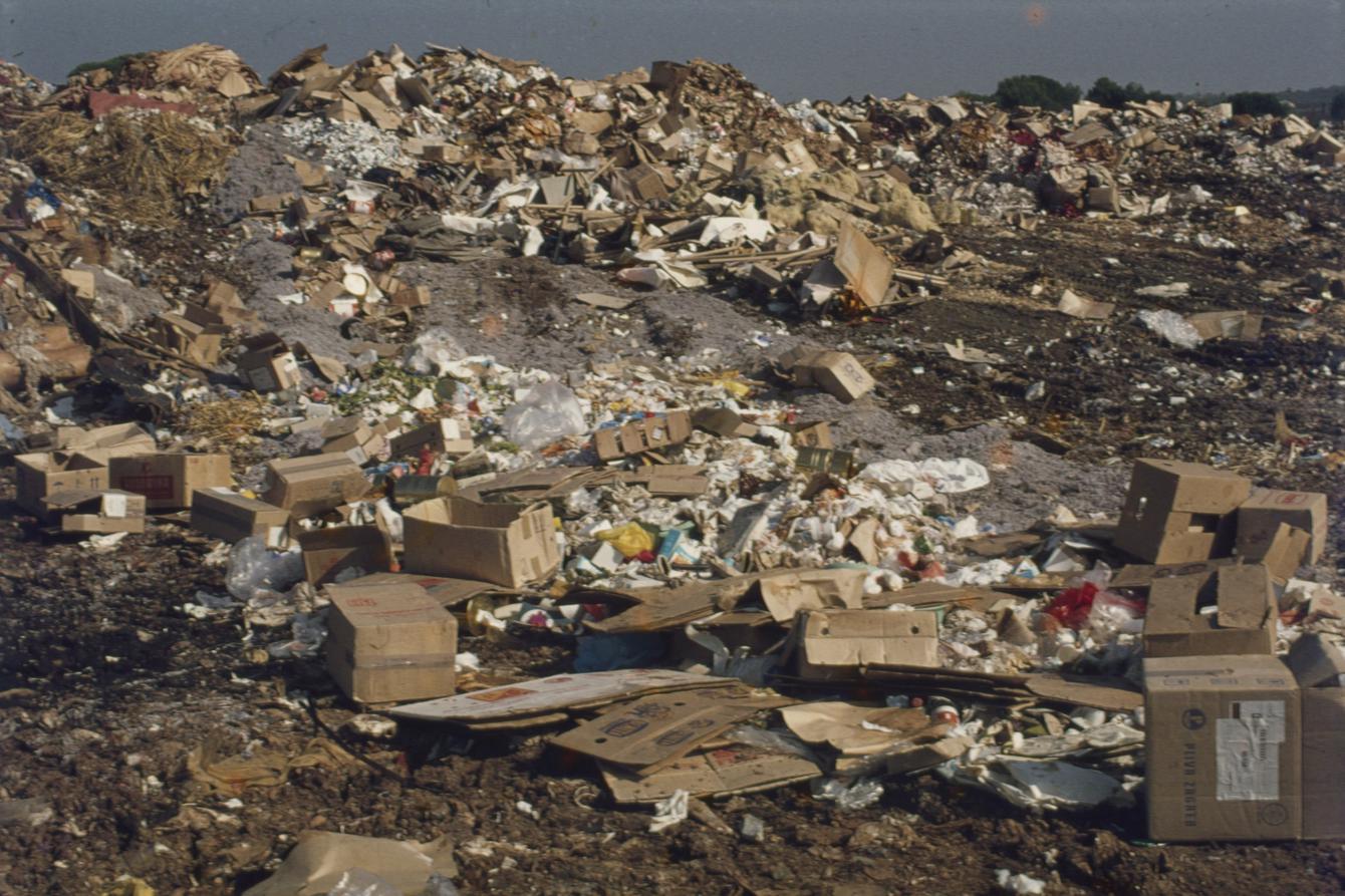 Gradski deponij; naslage smeća, u prvom planu kartonska ambalaža
