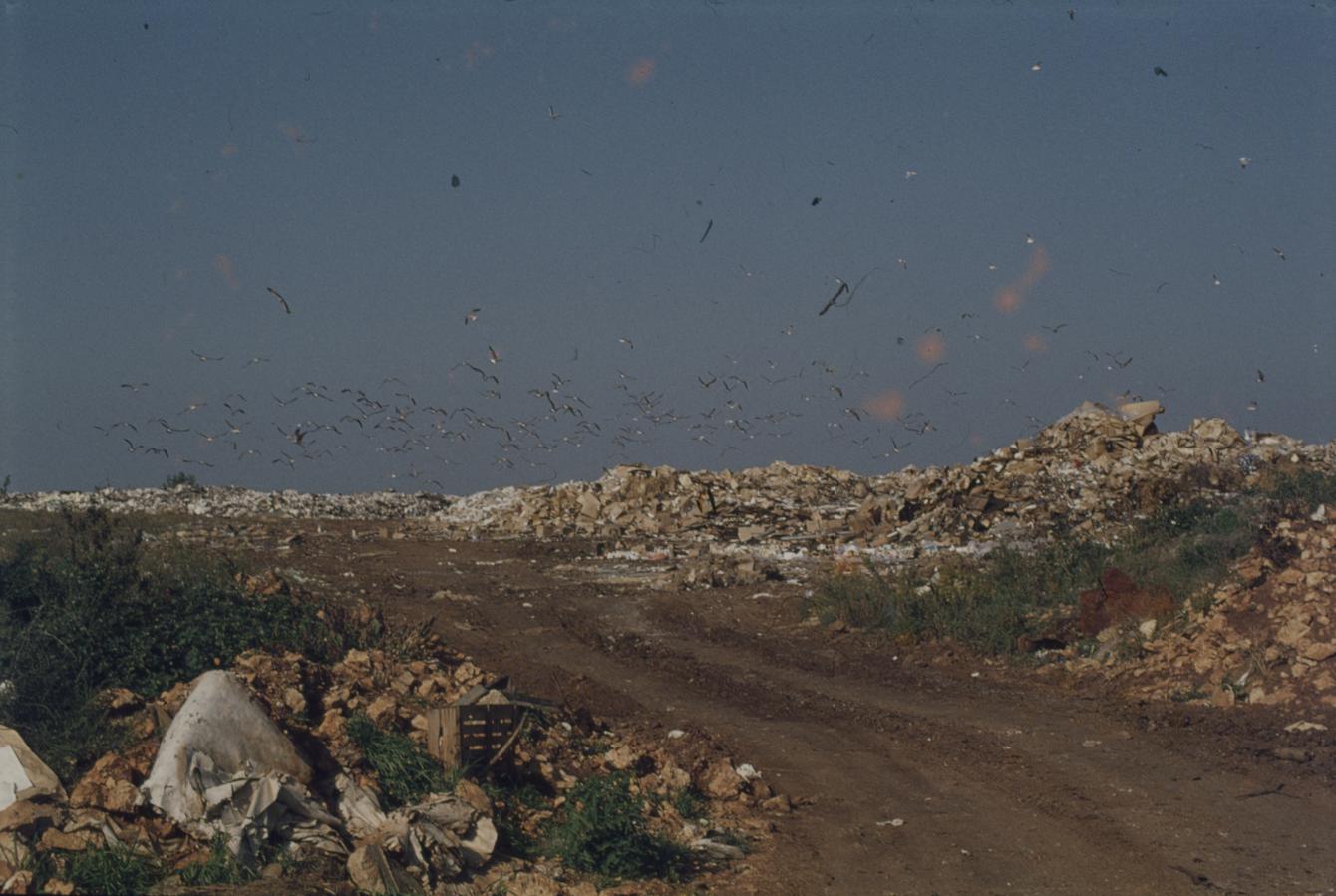Naslage smeća desno kao lanac; 13 h; galebovi u potrazi za hranom; gradski deponij