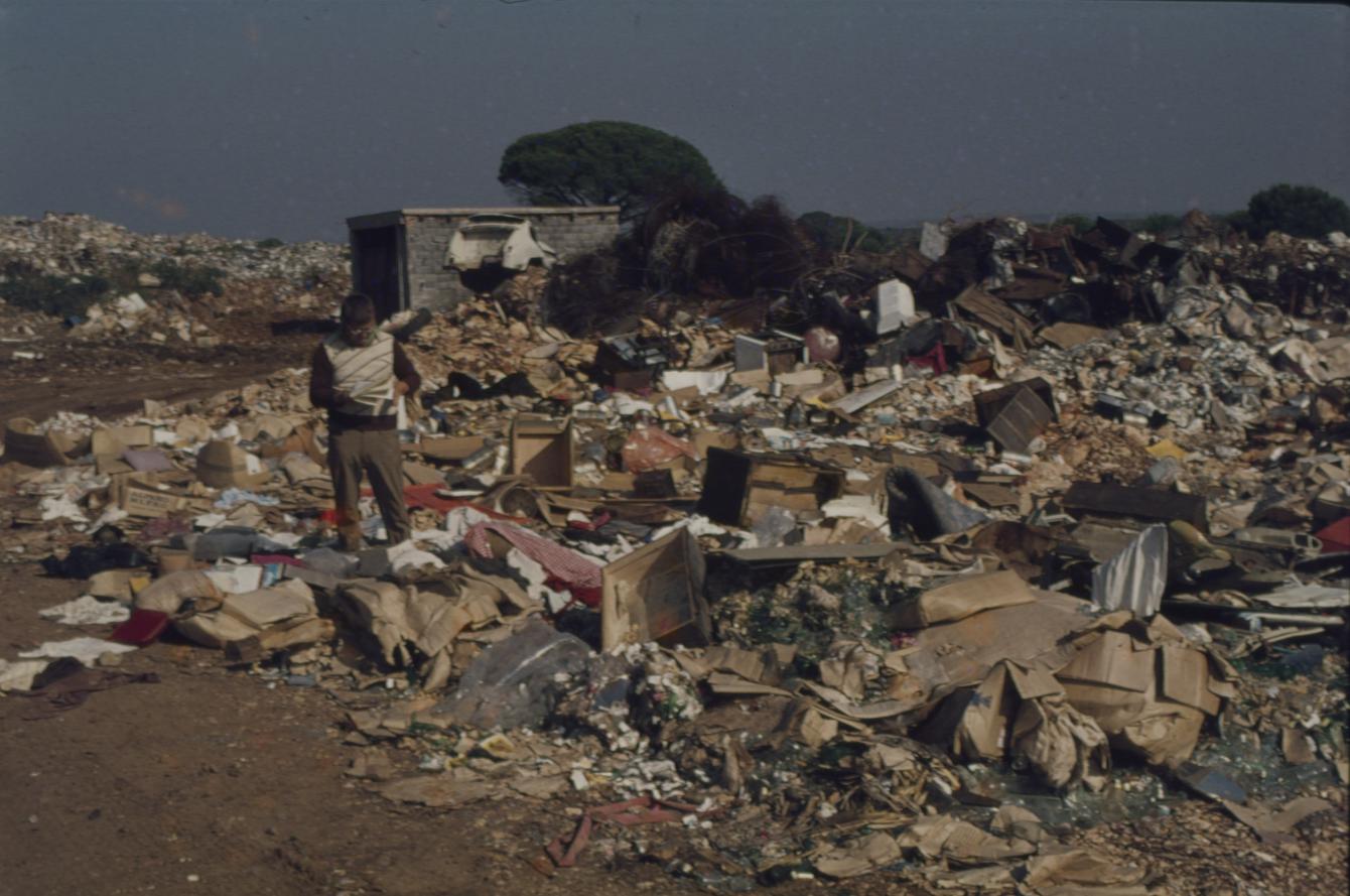 Pored bora u betonskim blokovima pod plažom kućica; u I. planu čovjek prebire po smeću; Gradski deponij